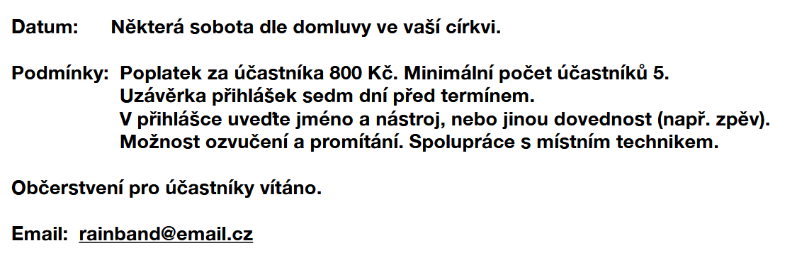14.6. proběhla Hudební poradna, která je určena všem, kteří vystupují nebo chtějí vystupovat ve chválících skupinách, mají úctu a zodpovědnost ke své službě a obdarování od Boha. Věnovali jsme pozornost aranžování jednotlivých nástrojů ve chvále a práci s obraty akordů, dynamikou a důležitosti improvizace k vyjádření okamžiku prožitku. Poděkování patří i Filipovi, který nám pomáhal se zvukem a byl součástí našeho společného vyučování.